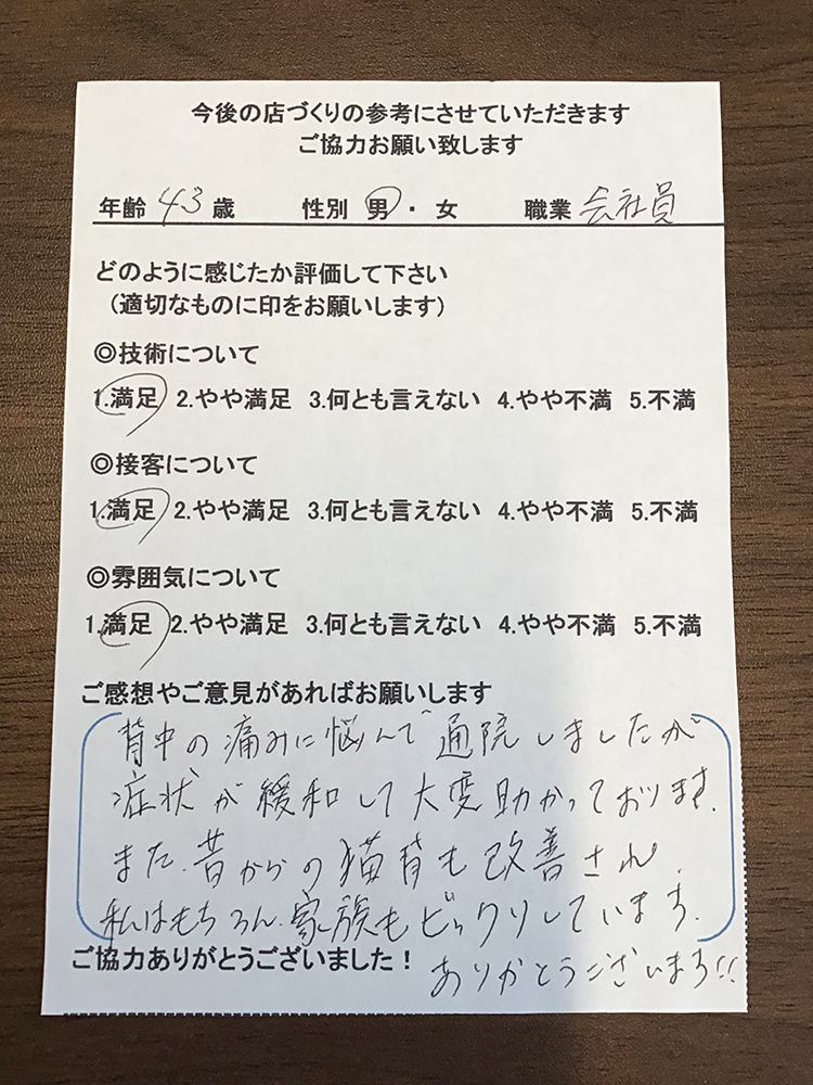 背中の痛みに悩んで通院しましたが症状が緩和して大変助かっております。